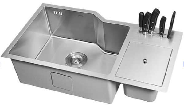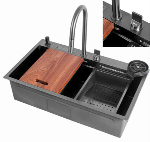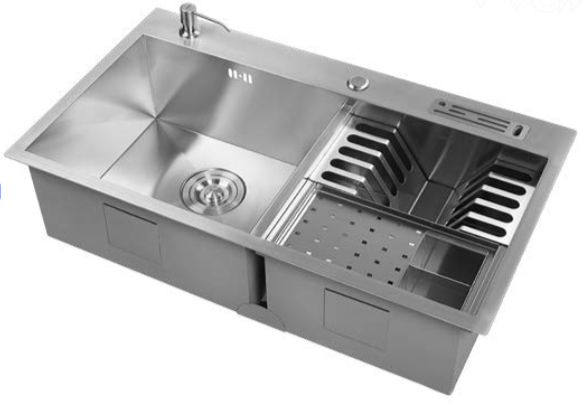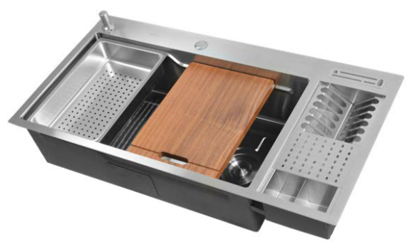 Ideal para quem precisa de praticidade sem abrir mão do design, ela vem equipada com dispenser de detergente, tábua de corte, bandeja em inox para higienização de alimentos e módulos escorredores que tornam o uso diário mais ágil e organizado.