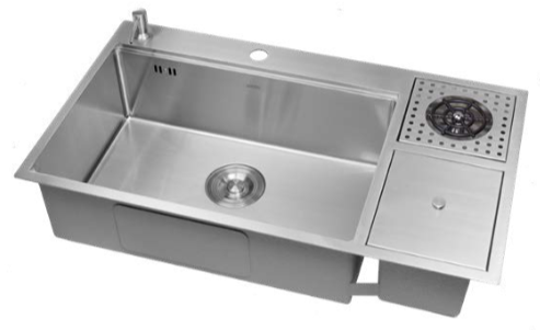 Cuba em aço inox 304 com acabamento escovado. Possui área de acessórios para instalação de misturador/torneira, faqueiro embutido e dispenser para detergente.