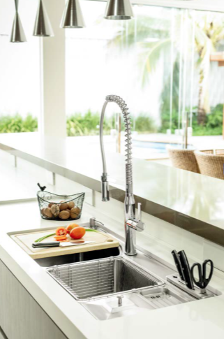Equipado com lava-copo embutido, dispenser para detergente, ducha cascata e misturador com mangueira extensível, torna as tarefas diárias mais eficientes.